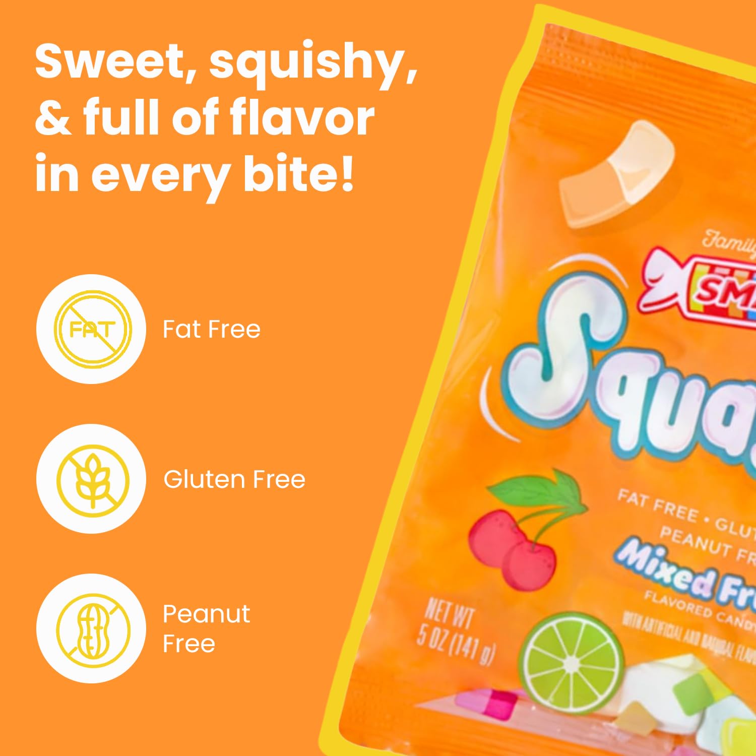 - Soft Chews: These aren’t your average fruit candies. Squashies offer a one-of-a-kind light and squishy chewy fruit candy that makes them easy to love and hard to share. Whether in candy bowls, lunchboxes, or movie nights, they add joy to every occasion. Great as a birthday candy or Halloween candy.